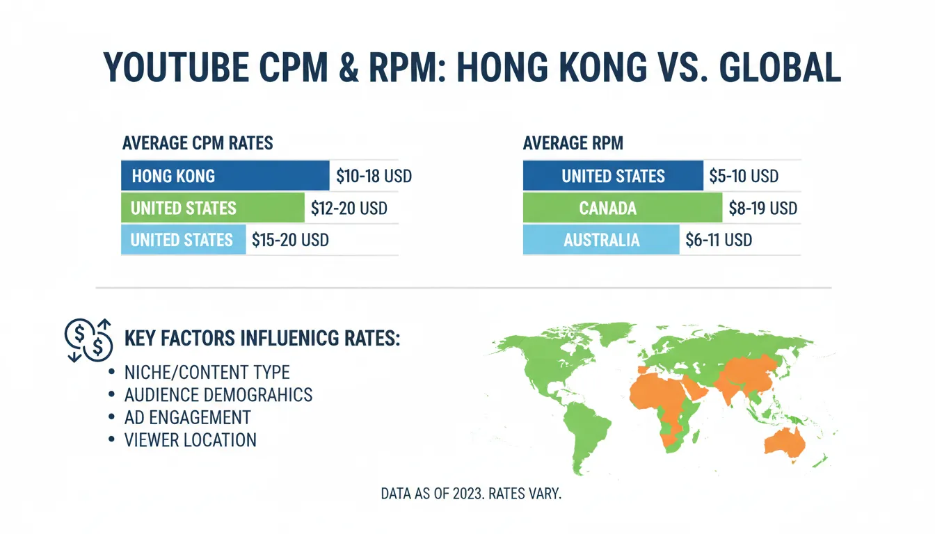 Hong Kong-based creators targeting overseas audiences (e.g., the US or UK) with English-language content can expect to earn $5–$15 RPM, which is still quite lucrative compared to the global average.