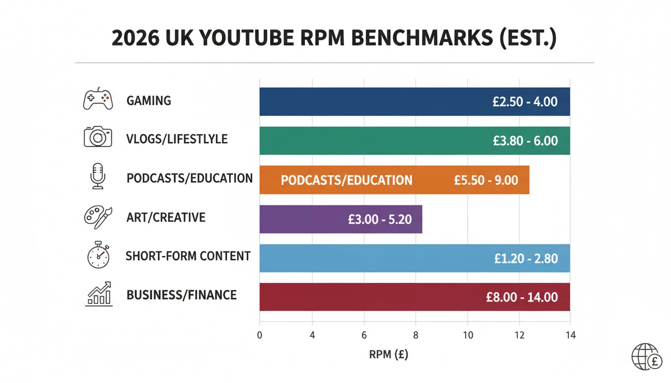 The average YouTube RPM in the UK is expected to range from £2 to £18 per 1,000 views, depending on the content niche. Specific benchmarks for 2026 include: