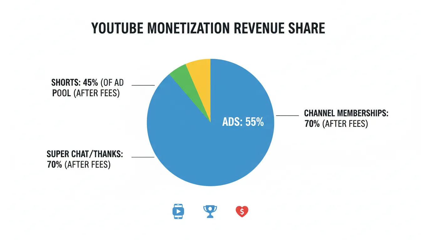 | Ads | 55% | 45% | Traditional YouTube Partner Program revenue share |